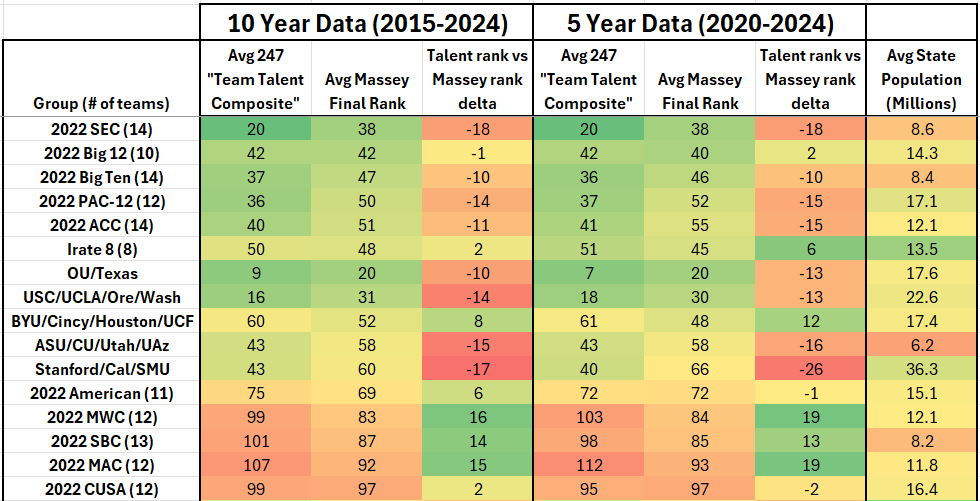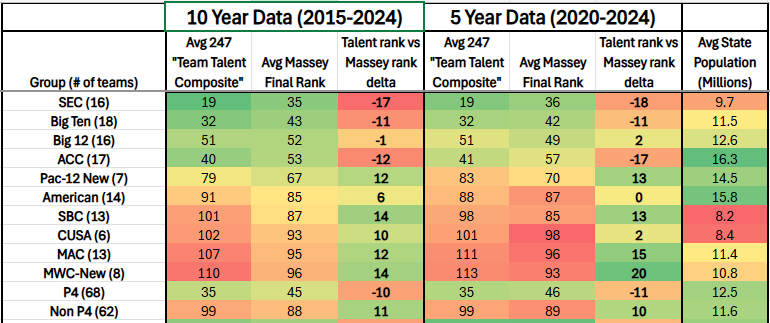 To delve into this, I looked at the average Team Talent Ranking (TTR) among FBS schools from 2015-24 (247 started measuring this in 2015) and compared that to the Massey Composite Ranking (MCR) over that same ten year period.
