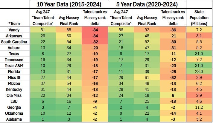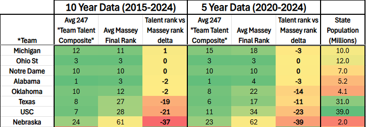 Methods: “Team Talent Ranking” (TTR) was measured by recording the 247 Team Talent Composite rank (raw rating score not used due to massive spreads & grade inflation over time) of every FBS team frrom 2015-24 and then averaging those after dropping the highest and lowest years. “Results” were measured by recording the final Massey Composite Ranking (MCR) from 2015-24 (2024 results here) and, similarly, dropping the highest and lowest years. The Massey Composite is derived from averaging 75-90 different ranking systems that all try to identify the best teams every year via their own unique criteria. The 247 Team Talent Composite is calculated by using the average High School rating of 4 different recruiting services (247, On3, ESPN & Rivals) for each player on the roster. The “Talent vs Results” figure was calculated by subtracting the MCR from the TTR. Teams with a positive figure were considered as “overperforming” expectations based on their TTR and those with a negative figure were listed as “underperformers.” Additionally, data for the last five years were separately calculated without dropping any of those years. Some statistical quirks* & examples are discussed at the end.