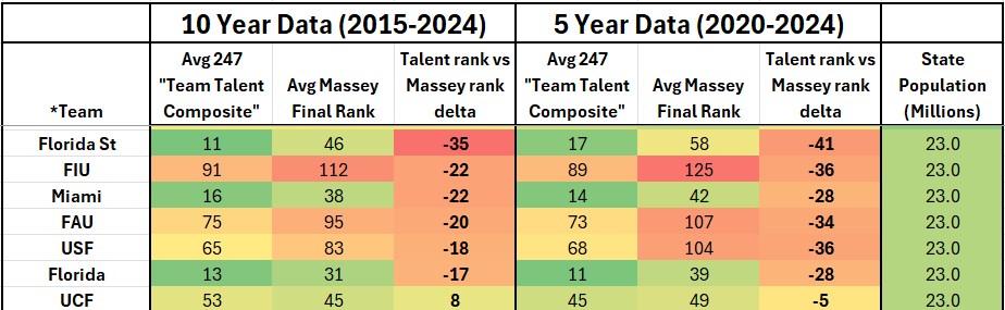 -In subsequent installments of this series, evidence will be presented showing that teams located in the largest states are usually underperformers while the smallest state schools nearly always overperform. Florida-based schools have massively underperformed their TTR by an average of 18 spots over the last 10 years, and by a whopping 30 spots over just the last 5 years. Even non-P4 teams such as USF, FIU, & FAU seem to either have rosters full of players with inflated talent rankings or all of those “Sunshine State” teams consistently underperform their talent. UCF is the best performing of all Florida-based schools at +8 over 10 yrs and -5 over the last 5, while Florida St was the worst at -35 and -41 respectively.